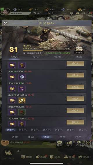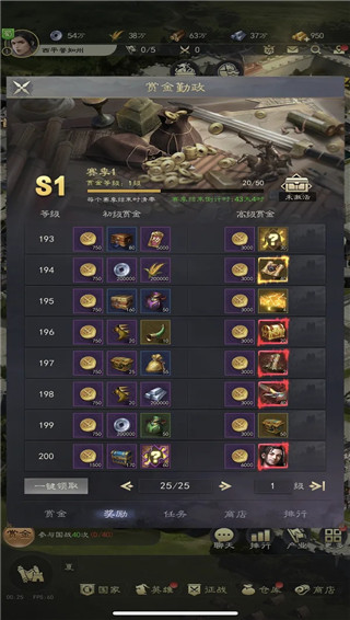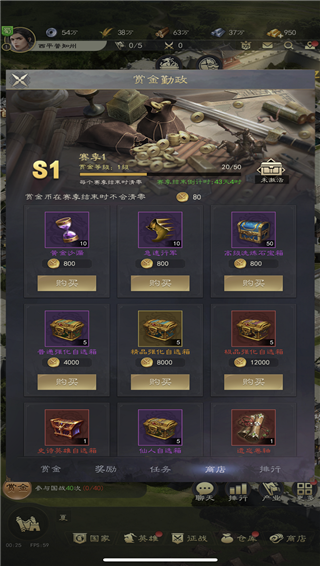 主公可完成各项赏金任务,任务可获得赏金币,可用于在赏金商店里购买大量高价值资源,主公可根据需要,攒积赏金币购买自己急需的资源。