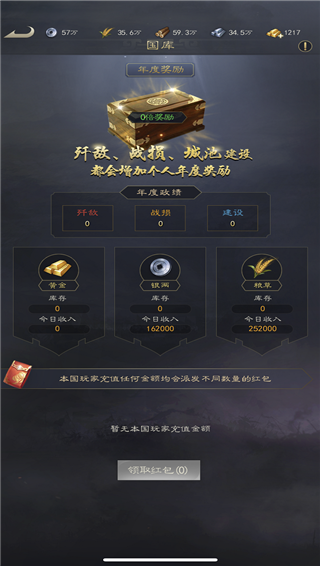 国库中可积累黄金、银两和粮草,这三种货币由占领的城池的税收组成,每年(一天为一个季度,一年为4天)一次结算。年度政绩分为:歼敌、战损和建设,这三个维度的政绩可提升个人年度奖励倍数,倍数越高(最高12倍),可获得的奖励及黄金越多。