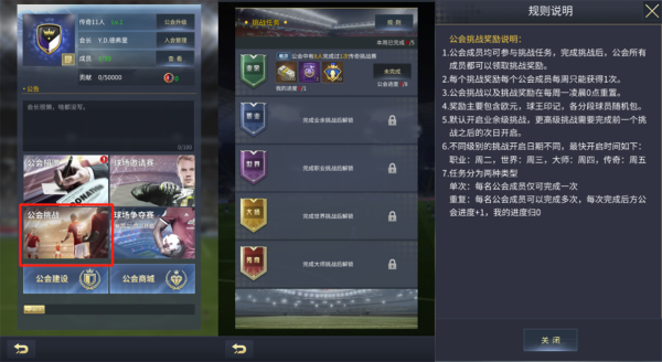 艾特足球手游中的公会挑战增强了团队合作的快感。公会成员共同努力完成挑战任务,任务达成后全公会成员都可领取奖励,下一阶段挑战次日开启。每周一凌晨0点,挑战进度重置。