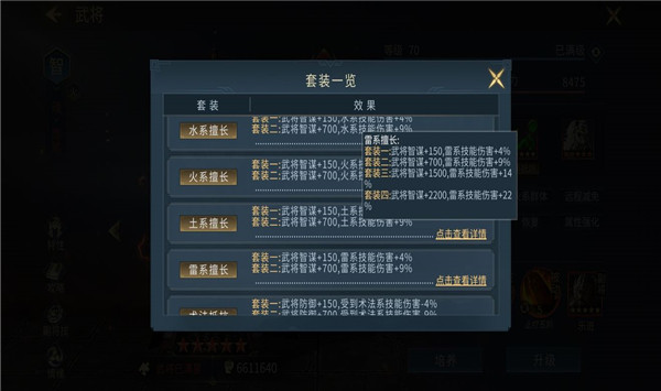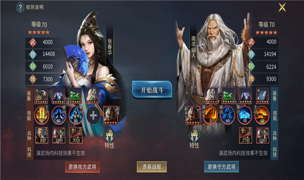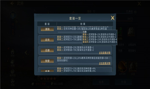 在初期,对于武力将来说,重要兵种就是床弩和金甲重骑,这样的配兵有很大的针对性,对上智谋将时,床弩可以在第一回合大幅度削减敌方的兵力,会极大降低智谋将的技能输出,究其原因是大多数智谋将的技能伤害都会计算自身兵力,当自身兵力降低时,技能伤害也会降低,从而打不出伤害。对上防御将时,在初期大家属性都差不太多的情况下,这样的配兵方法还是有一定优势,但事不绝对,毕竟防御将在大多数情况下均会克制武力将。而金甲重骑的出现,会极大提升武力将领的输出,金甲重骑属性高,而且克制刀、弓、器械系兵种并且在1、3、5回合时免疫刀兵的反击,这样在初期就可以不怕防御将携带刀兵来克制自己,但是事无绝对,枪兵还是对骑兵系有一定的克制。游戏截图