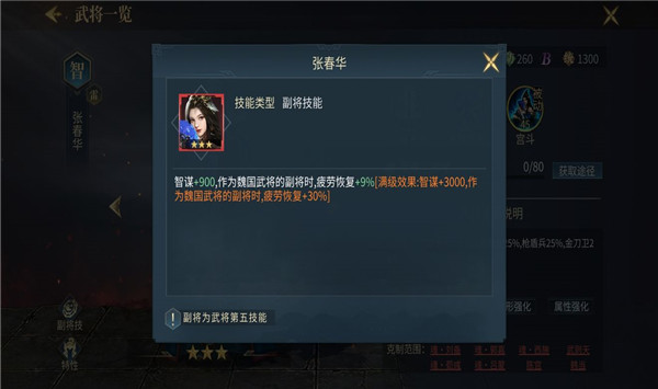1、张春华自身的副将技能也是非常顶尖的,加3000智力的高端配置不说,给魏国武将搭配的时候,还能加速回复疲劳,跟魂荀彧、魂郭嘉等魂将搭配也是极好的选择。