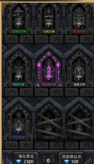 通关特定关卡后解锁,开放神位,消耗资源提升神位等级,战斗中获得超强效果。