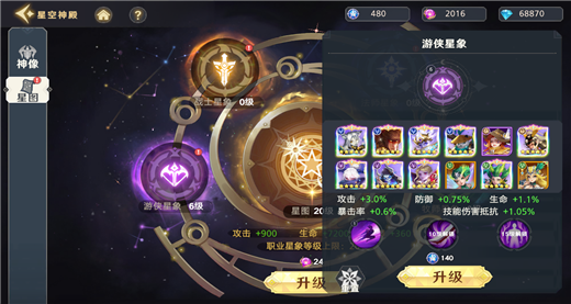 玩家首次获得初始稀有英雄,或将初始稀有英雄首次升阶至更高品阶时可获得星辰,星辰可提升星图等级。星图等级可以给全队英雄提供额外的攻击力、生命值和防御力加成。