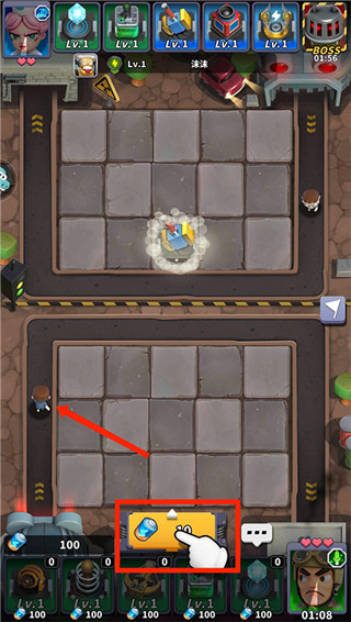 5、进入【游戏对战】界面,玩家可以点击【蓝色电池】按钮来放置炮塔,炮塔会对通道上的僵尸进行射击,击败后会获得电池奖励,从而放置更多的炮塔,对战双方谁先消灭僵尸则为获胜方