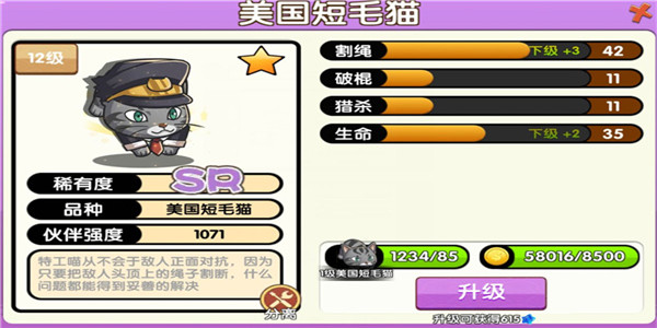 2、日本田园猫的技能对绳子具有百分比伤害的加成并且能造成三段打击威力十足。技能释放不像特工喵需要瞄准,它的技能是自带穿透性的,所以操作也十分方便。