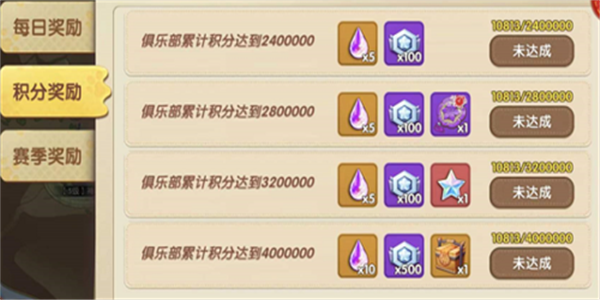 (3)俱乐部累计积分达到【积分奖励】积分要求,即可领取对应奖励,【积分奖励】最高积分要求为4000000。