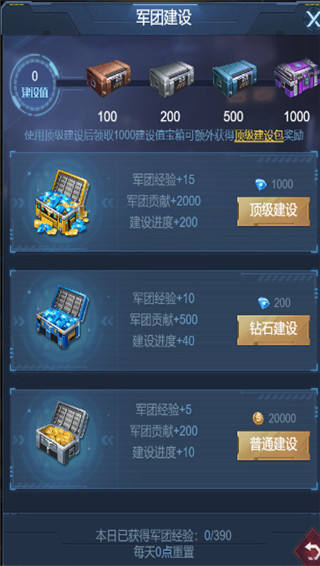 可以进行三个档次的建设,为军团提供军团经验,提升军团等级,开启更多功能与玩法。