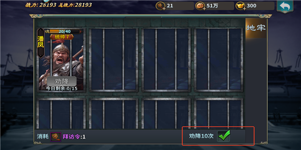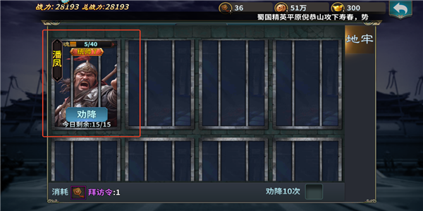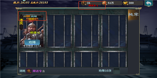 4、此时我们可以看到在劝降时是会消耗拜访令的,同时武将将魂也会逐渐增长