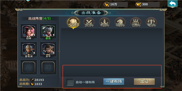 4、这里我们可以先进行一键布阵,然后再点击出征