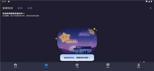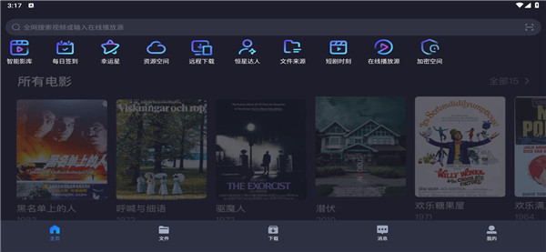 1、首页中有着丰富的影视资源等你体验,上方则是诸多功能板块,有智能影库、每日签到、资源空间、恒星达人等等