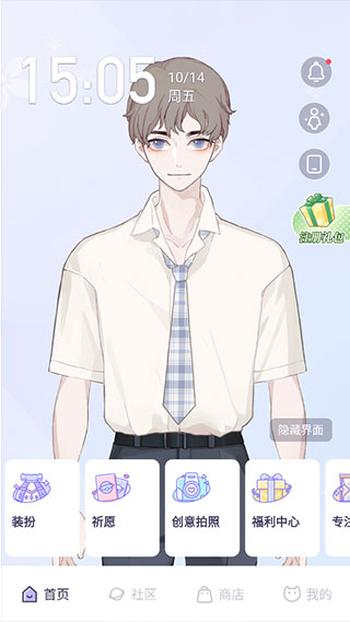 进入游戏后,你会发现软件界面类似手机主界面,左上角显示当前时间,下方功能包括装扮、祈愿和创意拍照等。