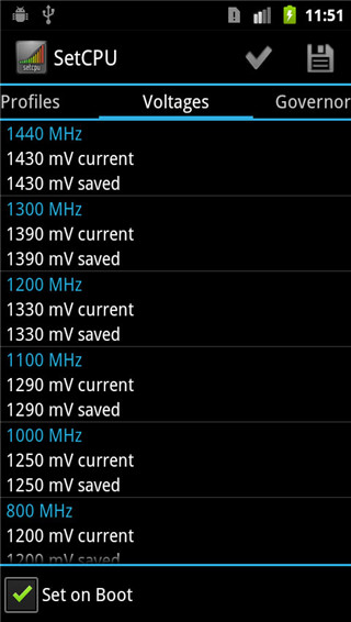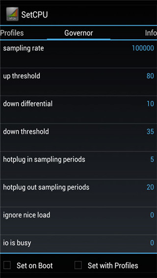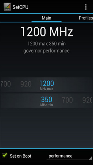 Set on Boot复选框允许SetCPU在您的设备首次启动时设置Main选项卡设置,因此您不必每次重新启动时都回到SetCPU。如果启用了配置文件,那么“启动设置”复选框也会启动配置文件服务。