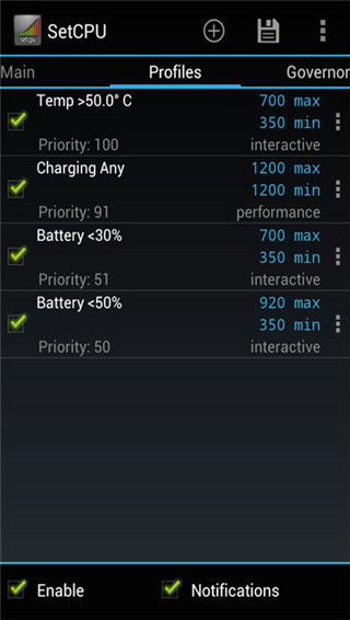 如果不满足任何条件,则不激活配置文件。SetCPU将在Main选项卡中恢复到上次保存的设置。如果通知被打开,这也被称为Main配置文件。