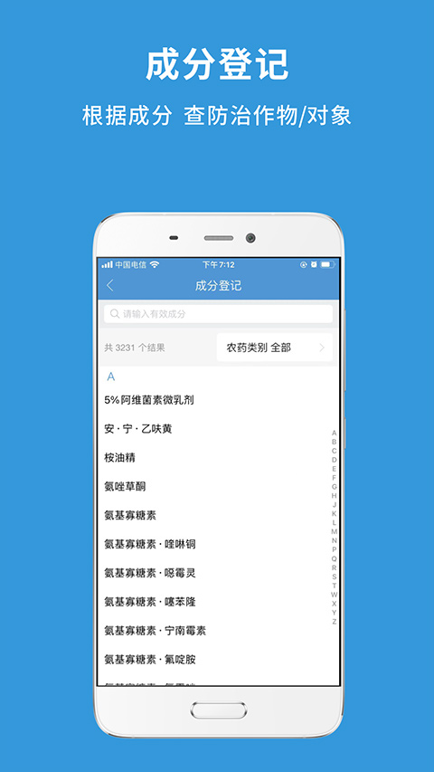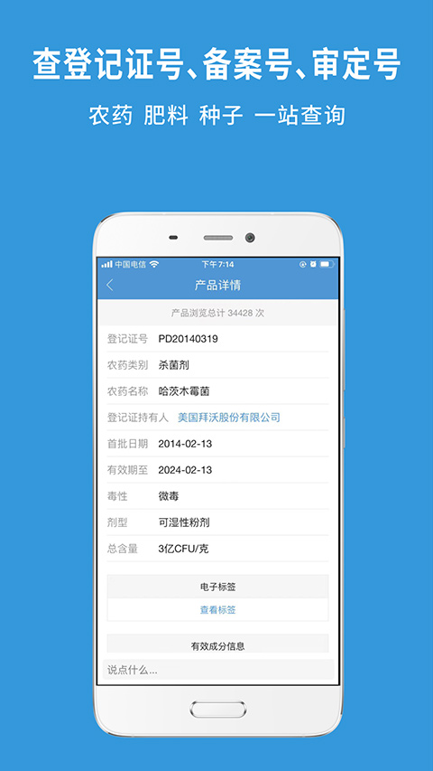 1、农药查询:便捷查询农药产品的详细信息,如登记证号、有效成分、适用病虫害等。2、肥料信息:详细查询各类肥料产品信息,包括登记证号、肥料类别、通用名称等。