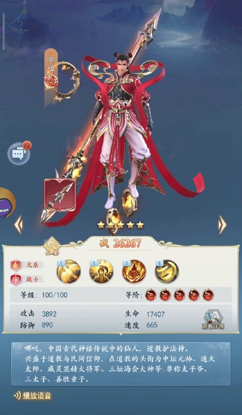 1、哪吒作为许多玩家喜爱的一员,哪吒作为火属性的主攻手,其100级时拥有卓越的3892攻击力、17407生命值、890防御以及665速度。在火属性英雄中,哪吒的实力不容小觑。对于普通玩家来说,哪吒相对容易获得,只需一点运气,便能培养出一名强大的哪吒。