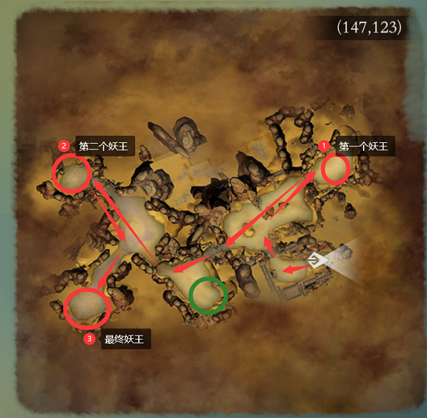 玩家需按照图中红色箭头指示的顺序击败怪物。只有击败第一个妖王后,才能开启通往第二个妖王的路径,继而才能挑战最终的妖王。