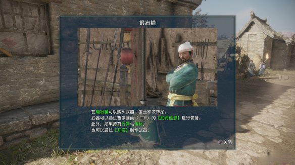 - 锻冶铺:进行武器、宝玉和装饰品的购买、出售和开发。不再通过战场条件获得秘武,而是通过购买和开发。终极武器的开发所需竹简可通过古币收藏家兑换。