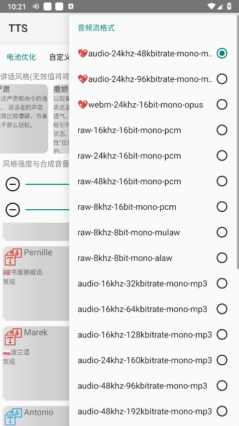6、返回tts app,可以选择不同的音质和讲话风格。