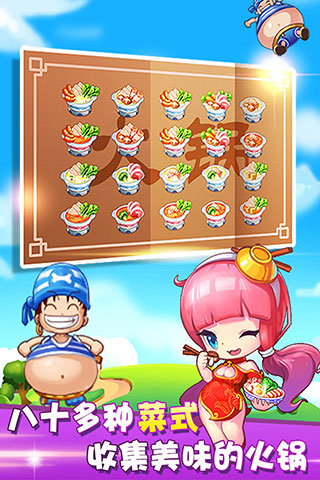 1、每日更新的免费食材奖励和多样化的全球主题场景更换。2、多种特色火锅的制作方法,快速选择正确的锅底和配菜。