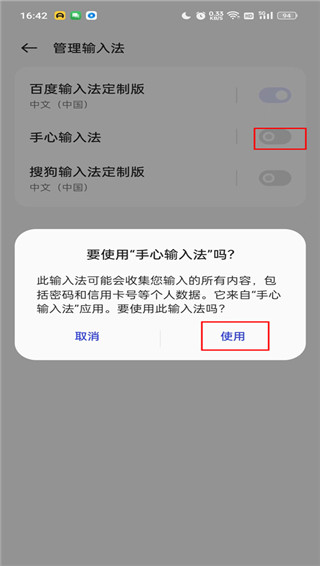 2、进入到输入法管理页面,点击打开手心输入法的使用;