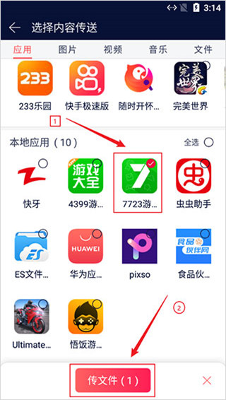 5、这样就和朋友的快牙连接成功了哦,然后是选择你需要传输的文件了,第一步是找到如箭头1所示的那个图标,然后往下翻找到“本地应用”,这样就能给朋友传输自己的软件了,接着只要选择你需要传输的软件就可以了哦;