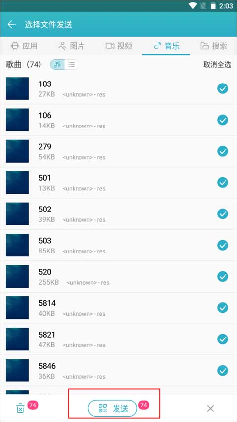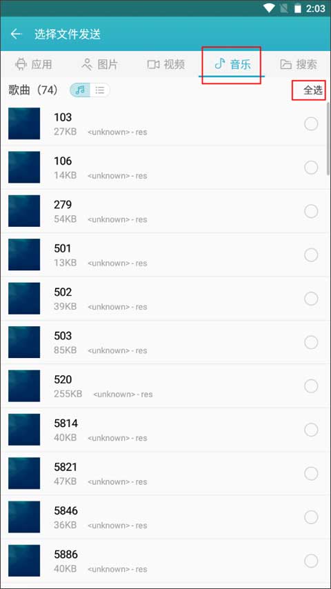 2、切换到音乐传输界面,勾选要传输的音乐文件。