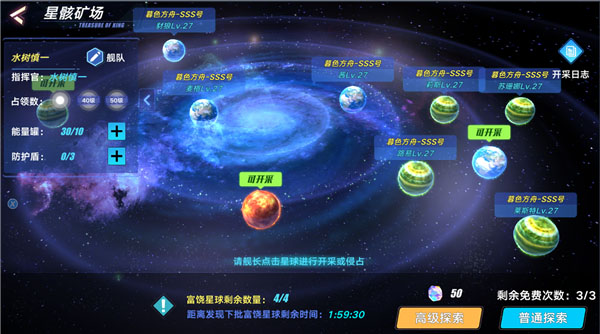 打开矿场的界面,可以看到在浩瀚的星云之中,环绕飞行着许多星球,其中有3个星球标注着“可开采”的文字,这些是未被其他人占领的星球,我们可以前往去开采;另外一些星球是已被他人占领的星球,指挥官可以去掠夺;