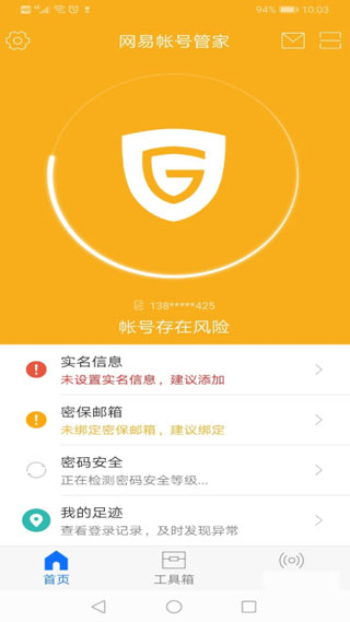 网易账号管家app是网易公司推出的专业级网易帐号安全管理软件。这款软件继承了网易20年的账号保护经验,支持网易邮箱账号和网易手机账号的全面保护。该软件可以同时管理多达15个账号,提供了包括安全监测、登录保护、账号足迹、登录管理、一键锁号和快速改密等多项强大功能。