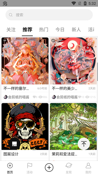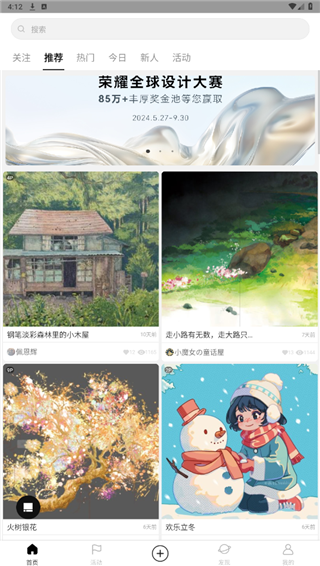 2、进入软件首页,可以看到诸多绘画作品,上方导航栏也清晰可见,包含热门、今日、新人等等