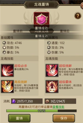 龙魂重铸后,属性、技能和技能数量都有几率发生改变。每次重铸都将消耗龙魂玉和铜钱,龙魂品质越高,消耗的龙云魂玉和铜钱越多。同类型的技能效果无法叠加,只按最高级别的生效。