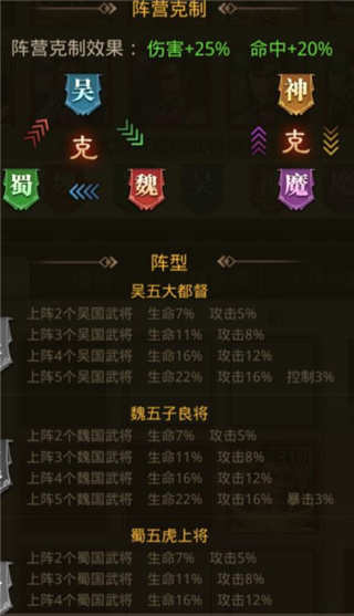 2、出战阵营:不同阵营的武将组合在一起有额外的属性加成以及阵营的克制效果;吴克魏克蜀克吴,神魔互为克制关系;