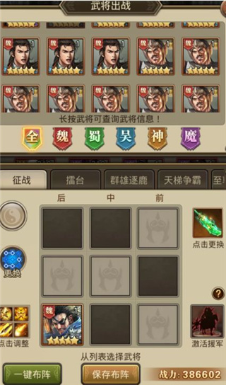 3、布阵玩法:目前布阵玩法有征战和擂台,在布阵界面选择武将后点击保持布阵,即可按提前布置好的阵营出战;