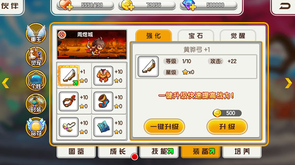 1.装备强化和升品装备强化升级可提升对应属性,强化升级只需少量的金钱。装备强化到相应级别的时候可进行升品,升品可提升大量属性。升品券主要在精英关卡掉落。