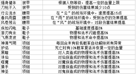 装备分为法宝、头饰、项链、披甲、腰带和鞋子;法宝基础属性为攻击、仙力和五行;头饰为魔法和血量;项链为仙力和魔法;披甲为耐力和速度;腰带为血量和耐力;鞋子为速度和攻击。