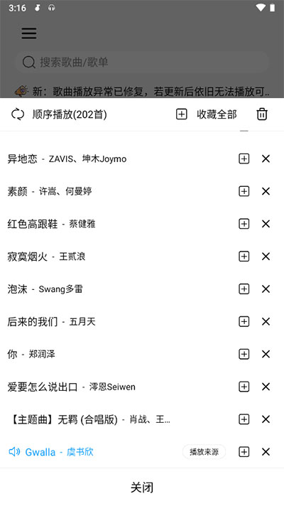 1)移除歌曲:点击歌曲旁的“×”按钮