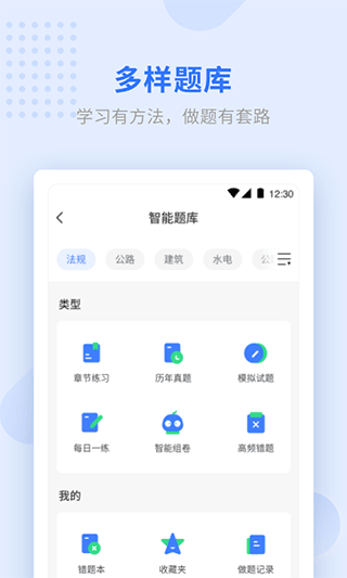 3、智能题库:包含历年真题、模拟题、章节习题,提供详细解析和错题本功能,支持错题消灭。