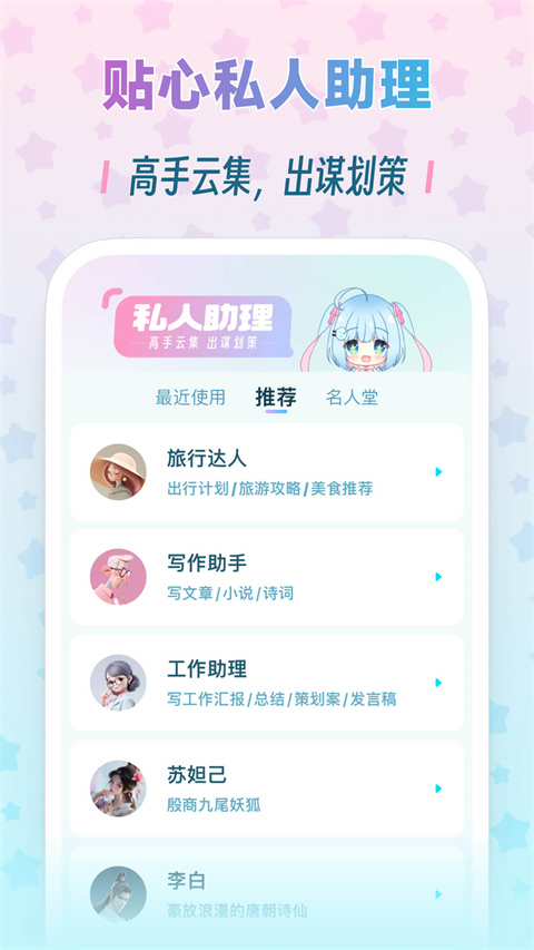 该软件区别于一般桌宠的亮点在于其高度智能化的设计,内置丰富的百科知识库,能够回答用户的各种问题,有效地协助解答疑难杂症。软件还具备多样的形象变换功能,从呆萌到二次元美女形象的转换,满足不同用户的审美偏好。此外,毒霸姬app官方版更是一个多功能的辅助工具。其AI写作功能尤其出色,不仅能助力于文案创作,还能进行文学创作和职场日常写作等任务,大幅提高用户工作效率。软件甚至可以模拟古代文豪进行虚拟对话,提供独特的人文体验。对于喜欢文学创作和寻求智能辅助的用户来说,毒霸姬app官方版无疑是一个值得下载体验的软件。