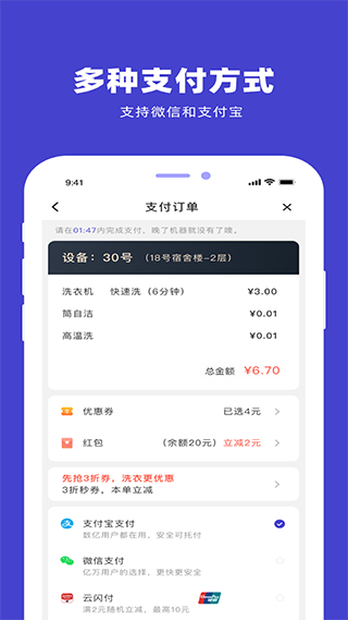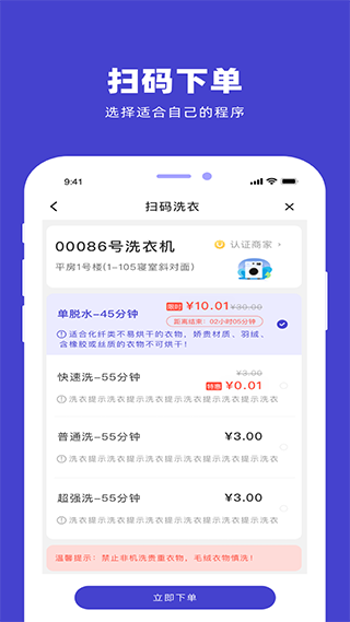 3、使用户能够足不出户就预约周边的自助洗衣机服务。支持现场扫码洗衣,用户可选择微信和支付宝等多种支付方式。此外,app还能实时显示洗衣倒计时,并在洗衣完成时及时发送信息提醒,确保用户能够及时收取衣物。这种便利性和及时性,大大的提高了效率