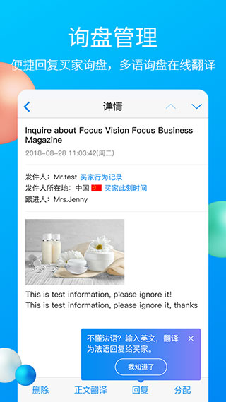 1、实时询盘管理:即时接收新询盘信息,迅速响应买家需求,实现询盘翻译和记录,提升沟通效率。