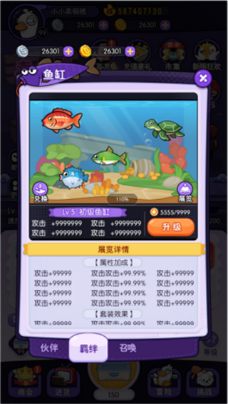 鱼缸养成包括鱼缸升级、鱼合成、鱼展览、鱼兑换、鱼图谱