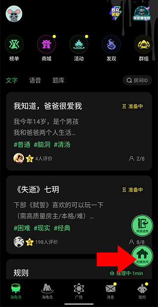 1、下载并打开海龟汤游戏app,选择右下角的“创建房间”选项
