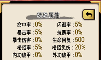 此外,还包括特殊属性,如命中率、闪避率、暴击率、抗暴率、暴击伤害、生命回复、格挡率、格挡减伤、内功破甲和外功破甲。