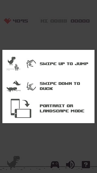 1、进入谷歌小恐龙游戏后,先点击右下角的问号图标查看游戏帮助和操作指南。