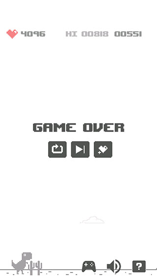 3、点击中间的播放按钮开始游戏,当遇到障碍物时,向上滑动屏幕使小恐龙跳跃。