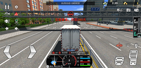 5、运输途中,玩家需要通过下方的地图导航到达目的地。同时注意安全带(位于刹车上方的红色图标),遵守交通规则,避免碰撞,否则会受到罚款并可能导致货物损坏;