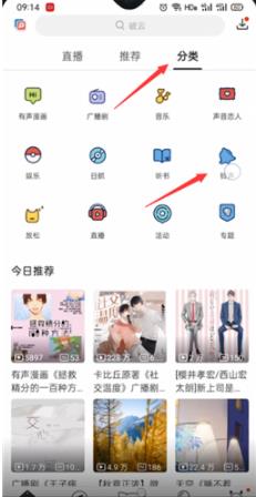 1、打开猫耳fm应用,点击首页的分类,选择铃声部分,这里有多种来电、短信、闹铃铃声供下载。