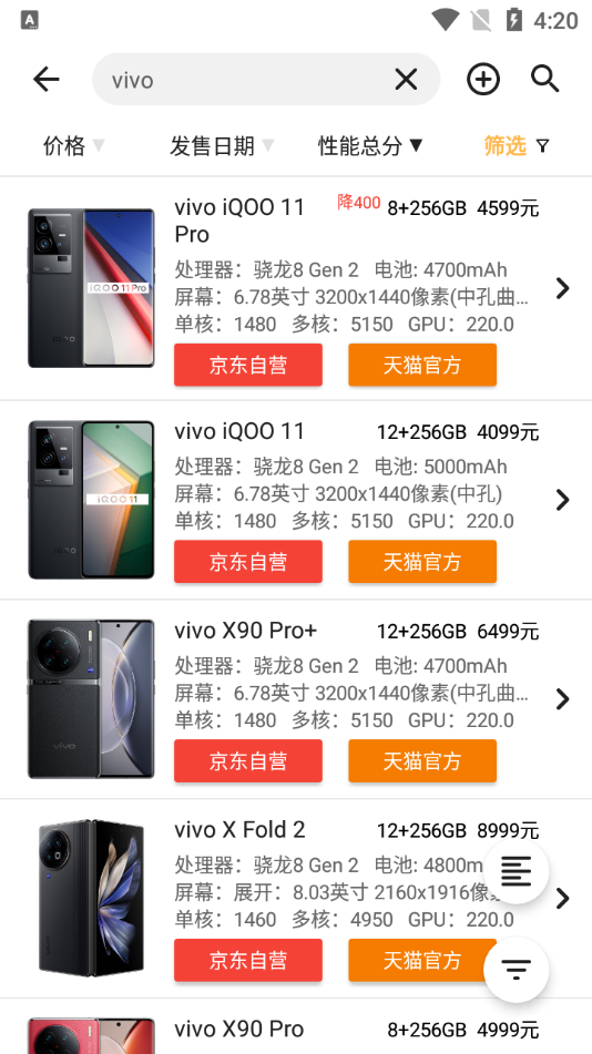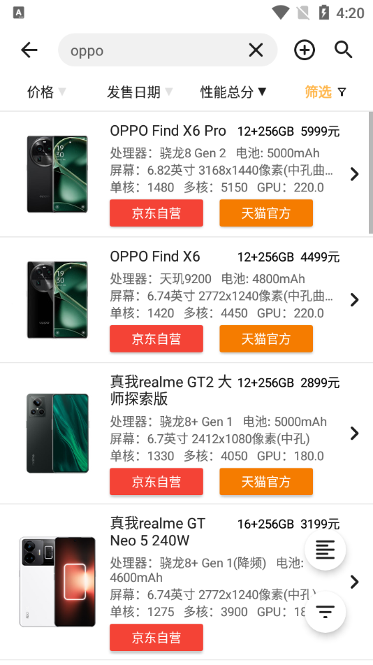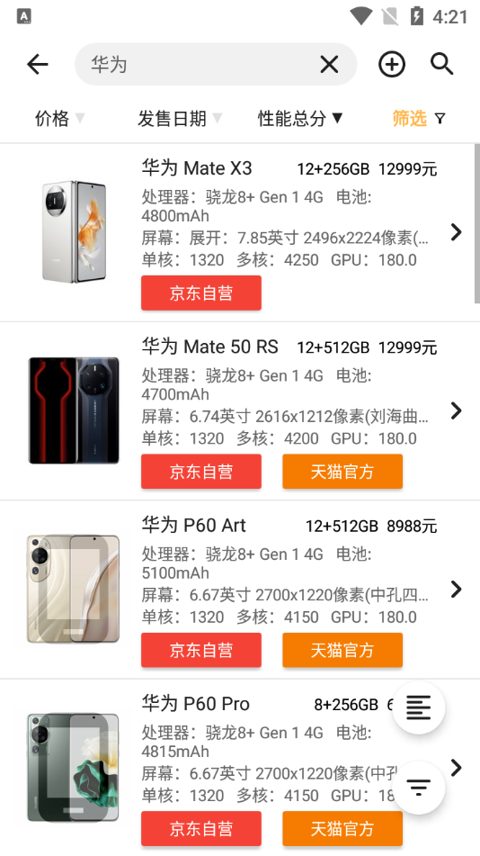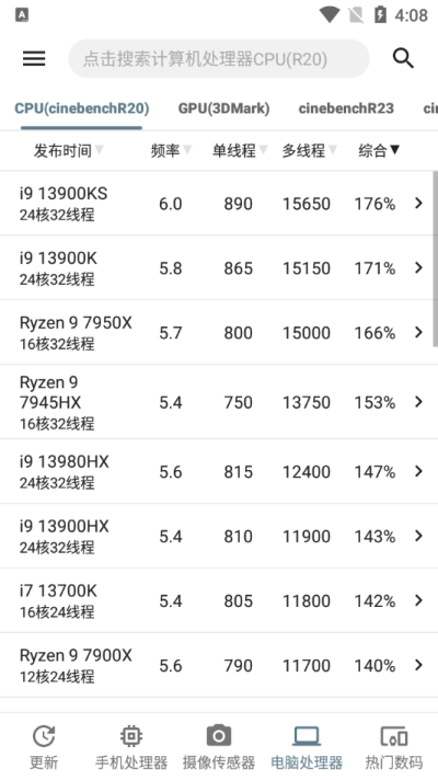 手机性能排行app官方版支持查看市面上主流手机处理器的性能得分。