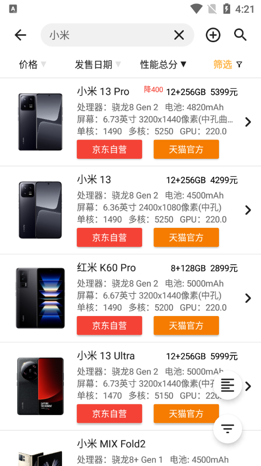 快速查看京东自营、天猫官方商城的标配版价格。