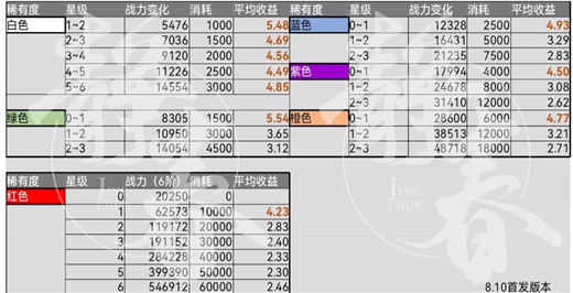 由此可见,所有法器的一星收益都很高,绿色以上法器的升星收益呈边际递减,5升6时收益会有所回升。