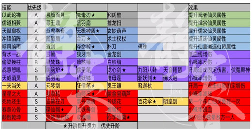 获得法器自选机会却不知道选哪个法器好时,可以参考下表的技能优先级和增加灵力效果的法器。